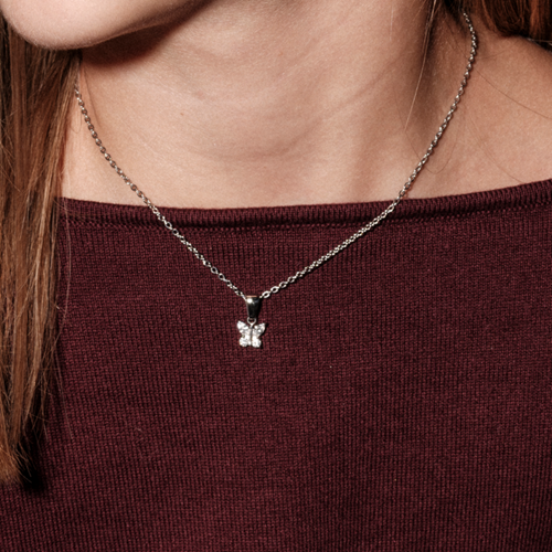Juni halsband från astrid&agnes.young är ett tunt halsband med en fjärilsformad berlock, dekorerad med stenar av cubic zirkonia. En tidlös detalj i miniformat som passar perfekt för barn från 5 år. Halsbandet är tillverkat av kirurgiskt rostfritt stål, vilket gör den tålig för både lek och vardagsanvändning utan att tappa sin färg eller lyster. En fin gåva som håller över tid. Alla halsband är 36 cm och har en förlängningskedja på 6 cm. Smycket levereras i en ask.