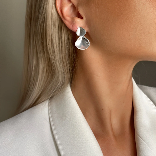 Ett par stora eleganta silverörhängen. Smycket består av två organiska former, ett mindre och ett större, som överlappar varandra i polerat silver. Dinglande statement-örhängen inspirerade av blomblad.