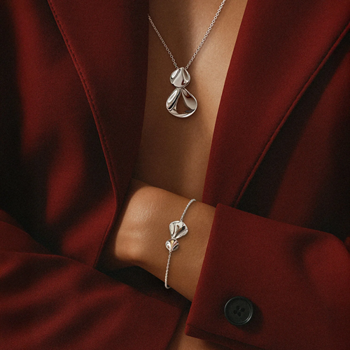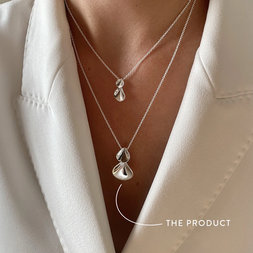 Ett vackert silverhalsband. Smycket består av två organiska former i olika storlekar, ett mindre och ett större, som överlappar varandra. Elegant och feminint smycke inspirerat av blomblad.