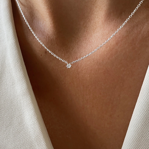 Ett nätt kort silverhalsband med en liten glittrande ädelsten, Vit Topas. Minimalistisk, elegant i skandinavisk design, perfekt smycke till vardag och fest. En vacker present att ge bort.
