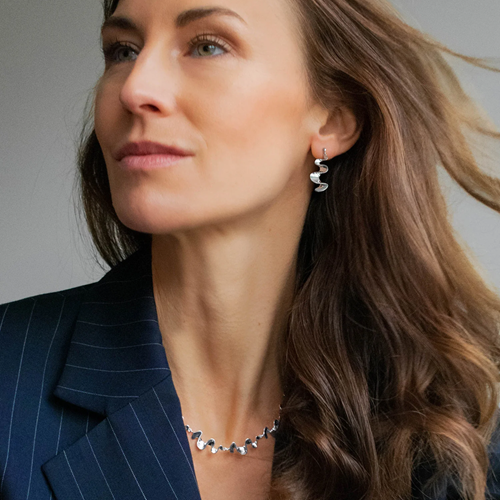 Polerade silverörhängen från Drakenberg Sjölin med mjukt böljande, skulpturala former. Eleganta och tidlösa silversmycken inspirerade av skandinavisk design, perfekta för både vardag och fest.