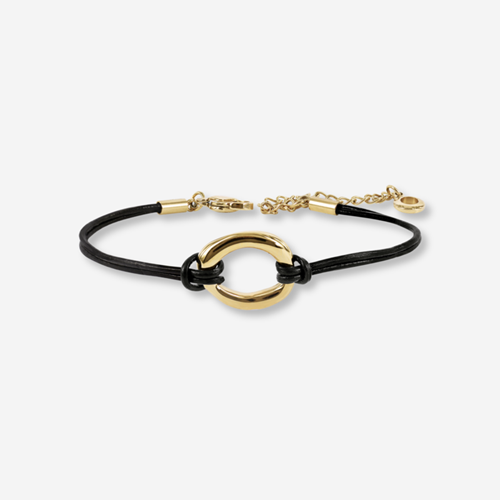 Angelina leather armband kombinerar en blank guldring i guldpläterat stål med ett svart läderband i äkta italienskt läder. En stilren design som förvandlar även de enklaste av outfits till något elegant.