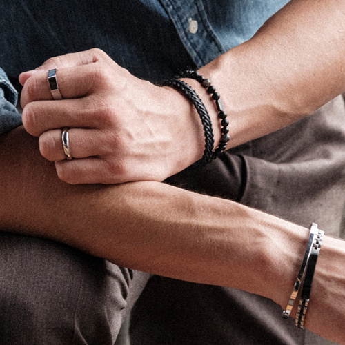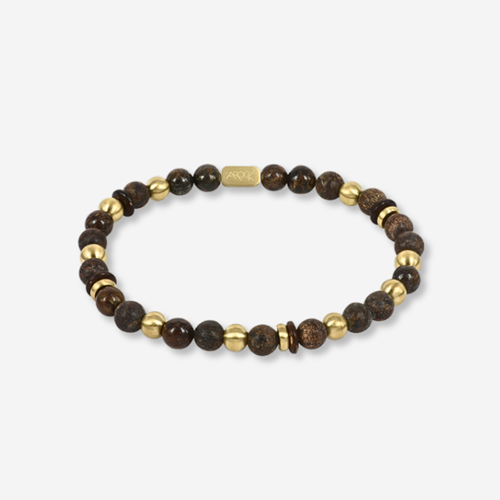 Eddie armband är tillverkat av ädelstenar i bruna toner från Bronzit och Tigeröga, med detaljer i matt 14k guldpläterat (PVD) kirurgiskt rostfritt stål. Detta kularmband är 6 mm brett och 19,5 cm långt med en elastisk passform. Levereras i ask.