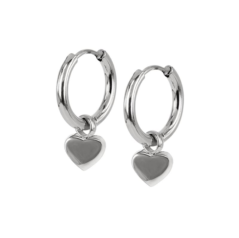 Blanka creoler i stål med hängande stilrent litet hjärta.