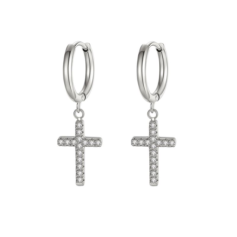 Creoler i stål med hänge i form av ett litet kors fyllt med klara, kloinfattade kristaller.