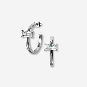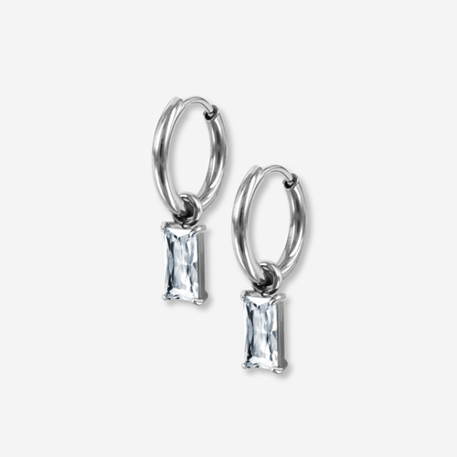 Melinda kreoler är klassiska örhängen designade för att vara enkla och bekväma att bära. Örhängena är tillverkade av stål och har en polerad yta med mjuk glans. Melinda är dekorerade med rektangulära kristaller från kubisk zirkonia som ger ett fint skimmer. Dessa örhängen är perfekta att bära hela dagen, oavsett om du ska till jobbet, klär upp dig eller vill ha ett dressat smycke till en avslappnad outfit.