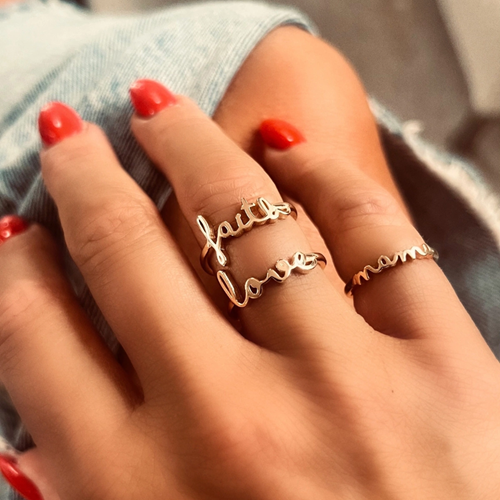 Tunn, justerbar och full av mening. "Mama"-ringen bär ordet mama i ett elegant, handskrivet typsnitt. Ett komplement till  Emma Israelssons populära halsband.
